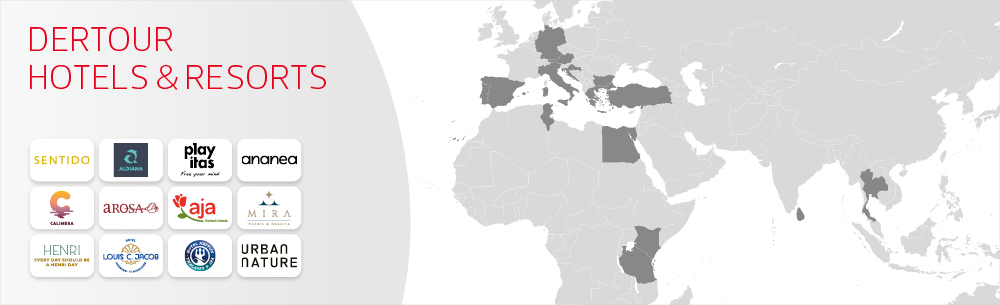 Bei DERTOUR Hotels & Resorts bündelt die DERTOUR Group ihr wachsendes Hotelgeschäft, das heute mit 13 Marken und über 120 Häusern in 14 Ländern weltweit vertreten ist. Weil Urlaubsträume und Reisewünsche ganz unterschiedlich sind, setzt die Hotelsparte der DERTOUR Group auf Vielfalt und höchste Qualität: So decken die Häuser unterschiedliche Destinationen, Zielgruppen und Gästebedürfnisse ab. Zum Marken-Portfolio gehören heute führende Marken der internationalen Club- und Ferienhotellerie.