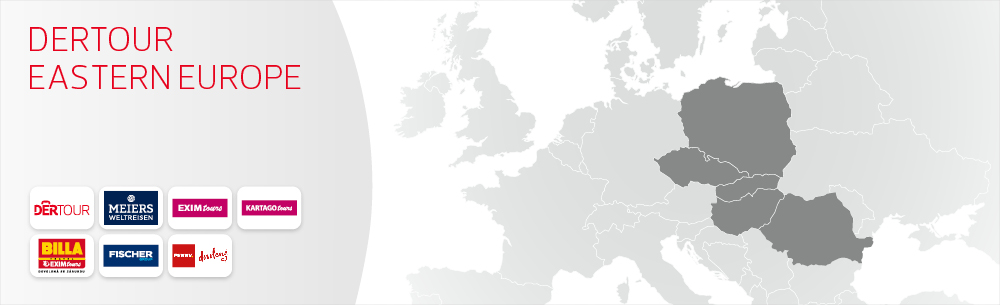 Die DERTOUR Group ist im osteuropäischen Markt stark vertreten und in den letzten Jahren kontinuierlich gewachsen. Mit den beliebten Reiseveranstaltern Exim Tours in Tschechien und Polen sowie Karthago Tours in Ungarn und der Slowakei zählt die Exim Holding zu den hiesigen Marktführern. Alle Reiseangebote der beiden Veranstaltermarken werden sowohl in den stationären Reisebüros als auch sehr erfolgreich online vertrieben.